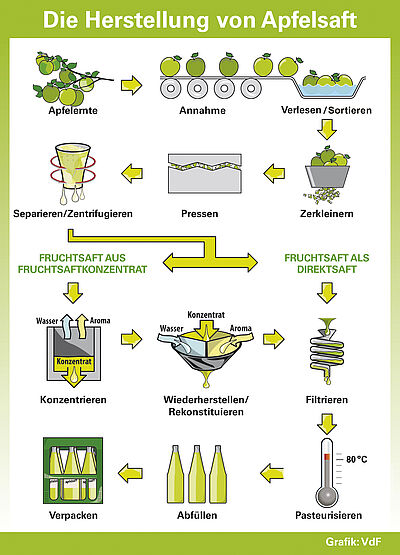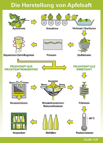 Äpfel beispielsweise werden nach der Ernte verlesen und sogleich aussortiert, denn nur jene Früchte, die sich im optimalen Reifezustand befinden, werden sorgfältig weiterverarbeitet. Nach dem Waschen werden die Äpfel in Mühlen zerkleinert und zu Maische verarbeitet, aus welcher dann durch schonendes Pressen Apfelsaft gewonnen wird. Hierbei entsteht zunächst naturtrüber Apfelsaft. Soll daraus klarer Apfelsaft werden, muss der Saft gefiltert werden.