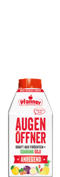 Es gibt Morgenmenschen – und es gibt uns. Darum haben wir für alle, die morgens etwas länger brauchen, einen saftigen Wachmacher kreiert. Ein Mix aus wertvollen Power-Früchten sowie Guarana und Koffein sorgen für einen natürlichen Energiekick und machen den Pfanner-Augenöffner zum idealen Wecker für Körper, Geist und Seele. Also, Augen auf und durch. Der nächste Morgen kommt bestimmt!