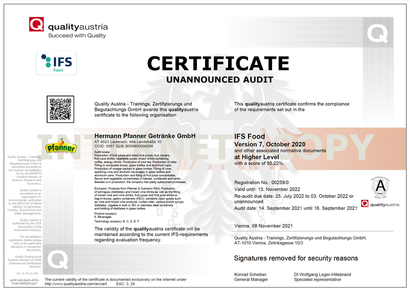 Spoločnosť Pfanner venuje veľkú pozornosť štandardu kvality vo svojom podniku. Certifikácie (ISO 2008:9001 a IFS) úspešne získali všetky závody na najvyššej úrovni. Pretože „láska k ovociu ako základ vysokej úrovne kvality“ nie je stredobodom koncepcie podniku bezdôvodne.